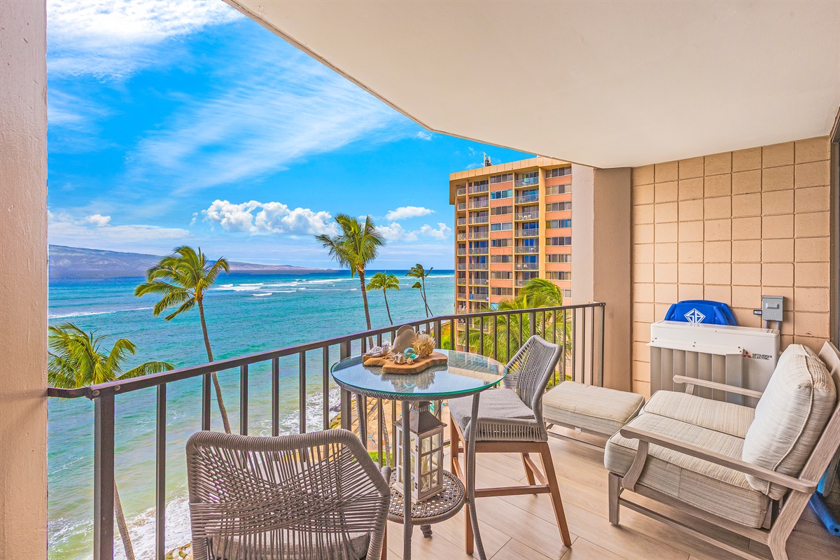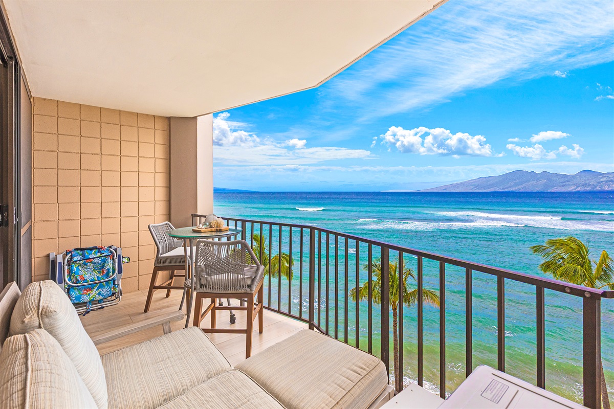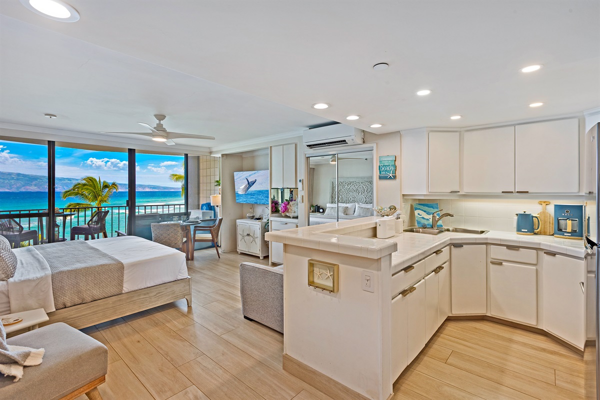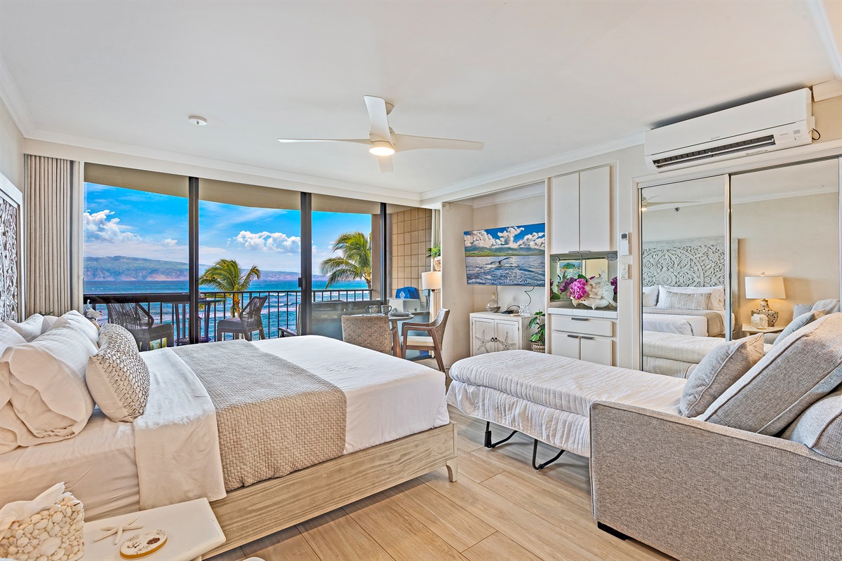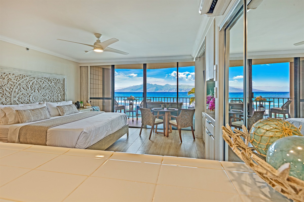 Studio • 1 Bathroom 1 Bath • Sleeps 1-2From the moment you arrive to Valley Isle 707, you will be mesmerized by the views of Molokai and Lanai. Step inside and find a spacious, modern living space with porcelain tiled floors, a luxurious King size bed, and a comfortable loveseat sleeper sofa. The fully-equipped kitchen features brand new stainless steel appliances and a Fisher-Paykel dishwasher, making it easy to whip up a delicious meal to enjoy on the lanai, surrounded by top-of-the-line outdoor furniture. With direct access to swimming, kayaking, and stand-up paddleboarding, you'll have plenty of opportunities to enjoy the blue ocean waters. This vacation rental is conveniently located a short drive from Ka'anapali, the West Maui airport, and some of the island's most popular beaches and attractions. Don't miss out on the chance to make unforgettable memories at our 5-star oceanfront paradise. Book your stay today!