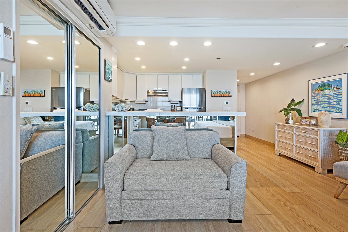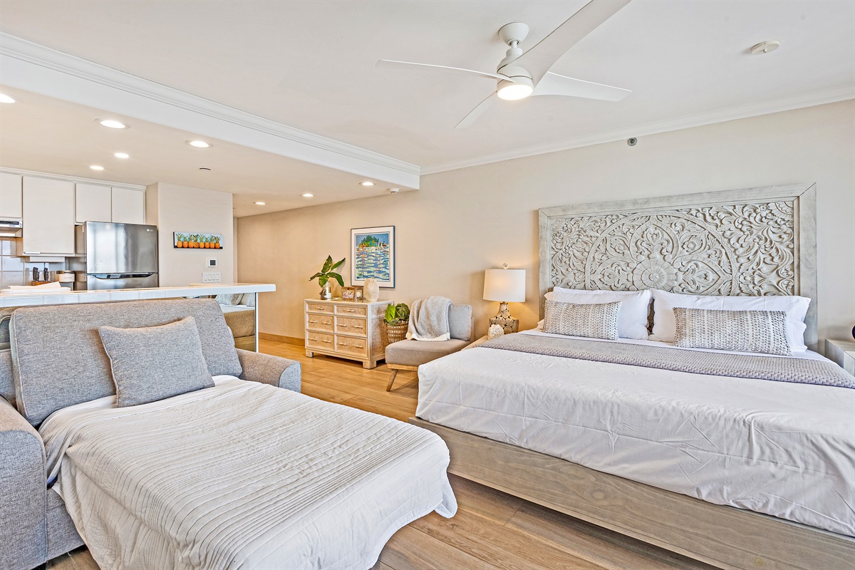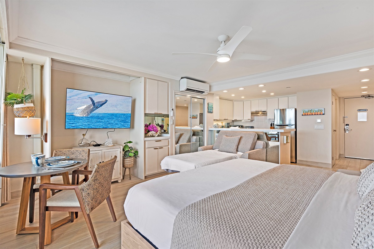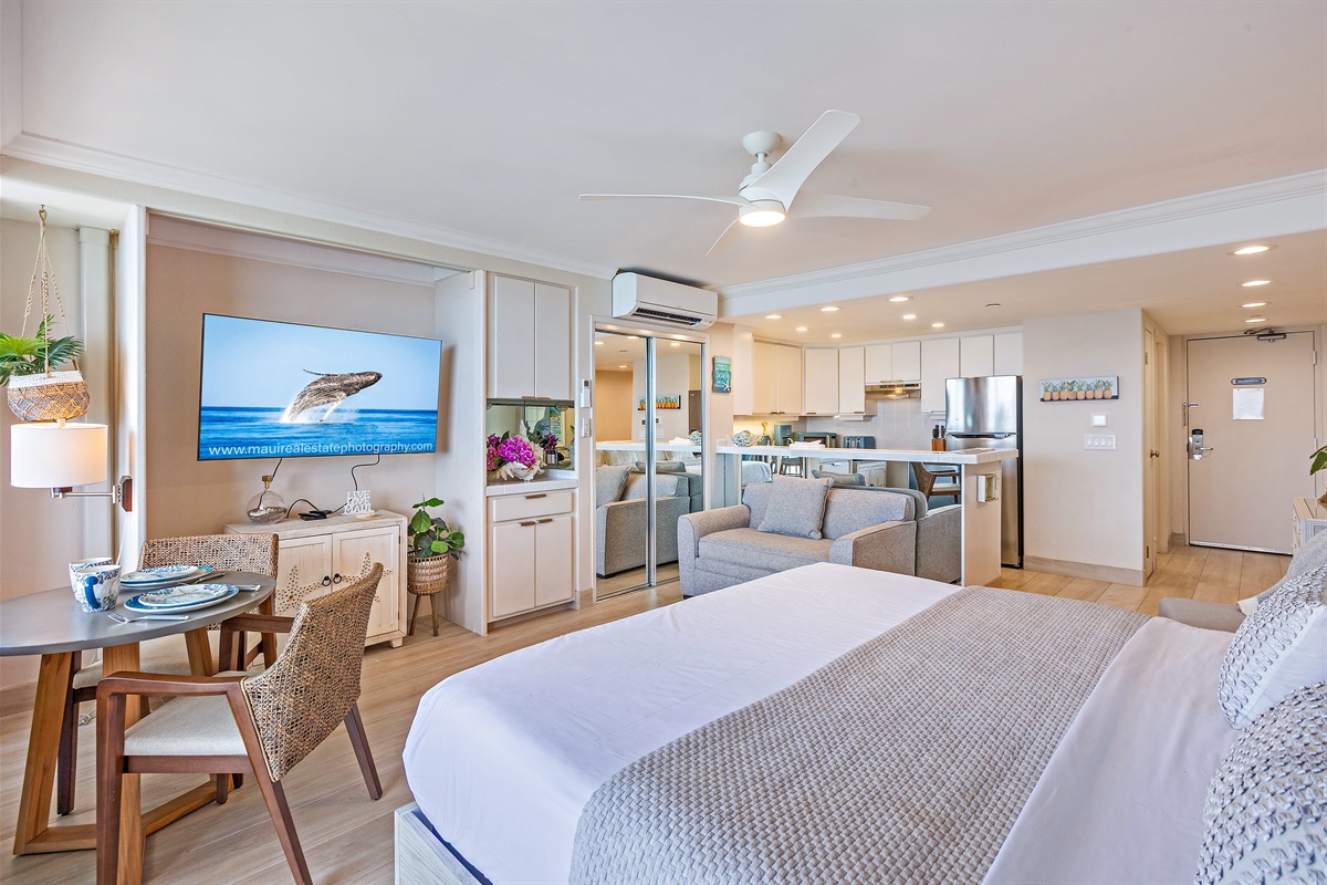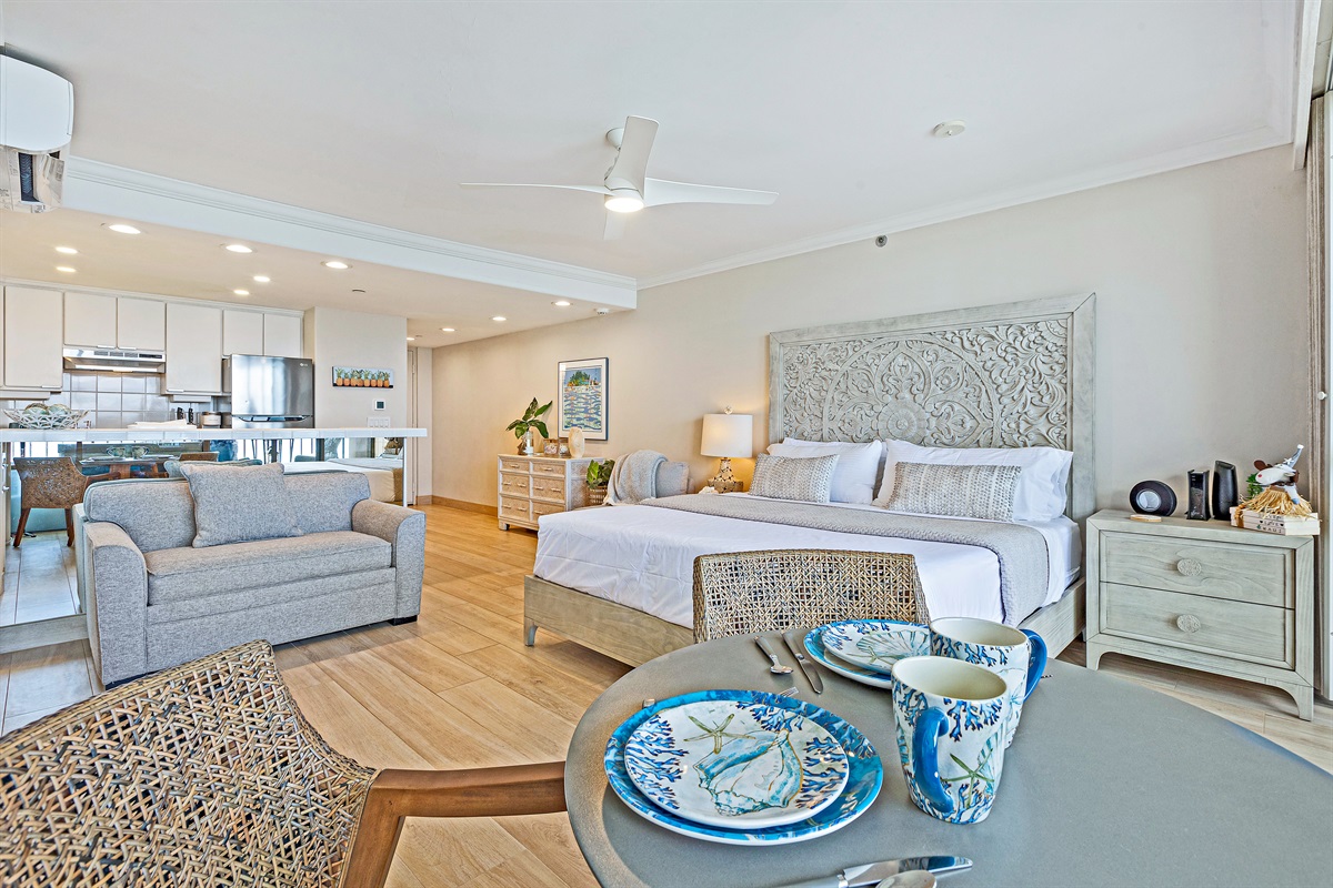 Studio • 1 Bathroom 1 Bath • Sleeps 1-2From the moment you arrive to Valley Isle 707, you will be mesmerized by the views of Molokai and Lanai. Step inside and find a spacious, modern living space with porcelain tiled floors, a luxurious King size bed, and a comfortable loveseat sleeper sofa. The fully-equipped kitchen features brand new stainless steel appliances and a Fisher-Paykel dishwasher, making it easy to whip up a delicious meal to enjoy on the lanai, surrounded by top-of-the-line outdoor furniture. With direct access to swimming, kayaking, and stand-up paddleboarding, you'll have plenty of opportunities to enjoy the blue ocean waters. This vacation rental is conveniently located a short drive from Ka'anapali, the West Maui airport, and some of the island's most popular beaches and attractions. Don't miss out on the chance to make unforgettable memories at our 5-star oceanfront paradise. Book your stay today!